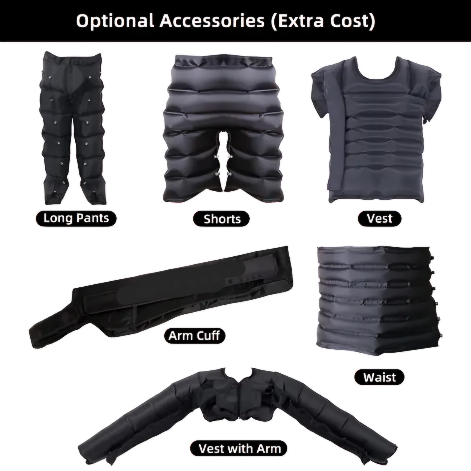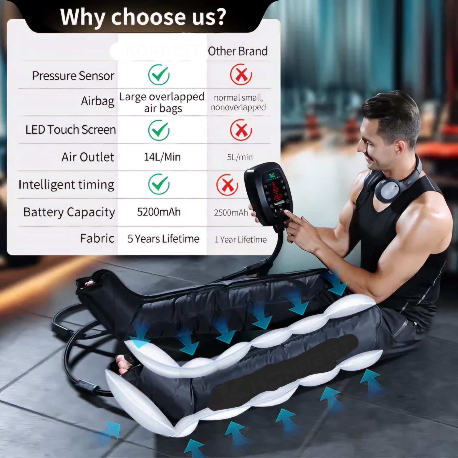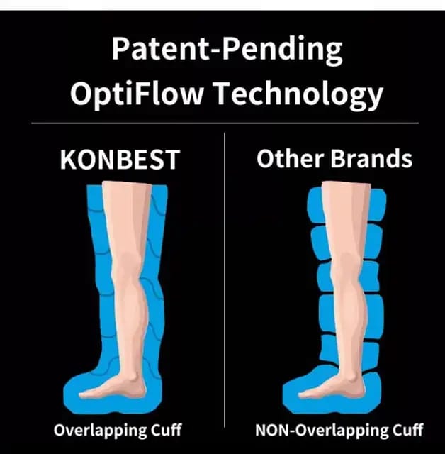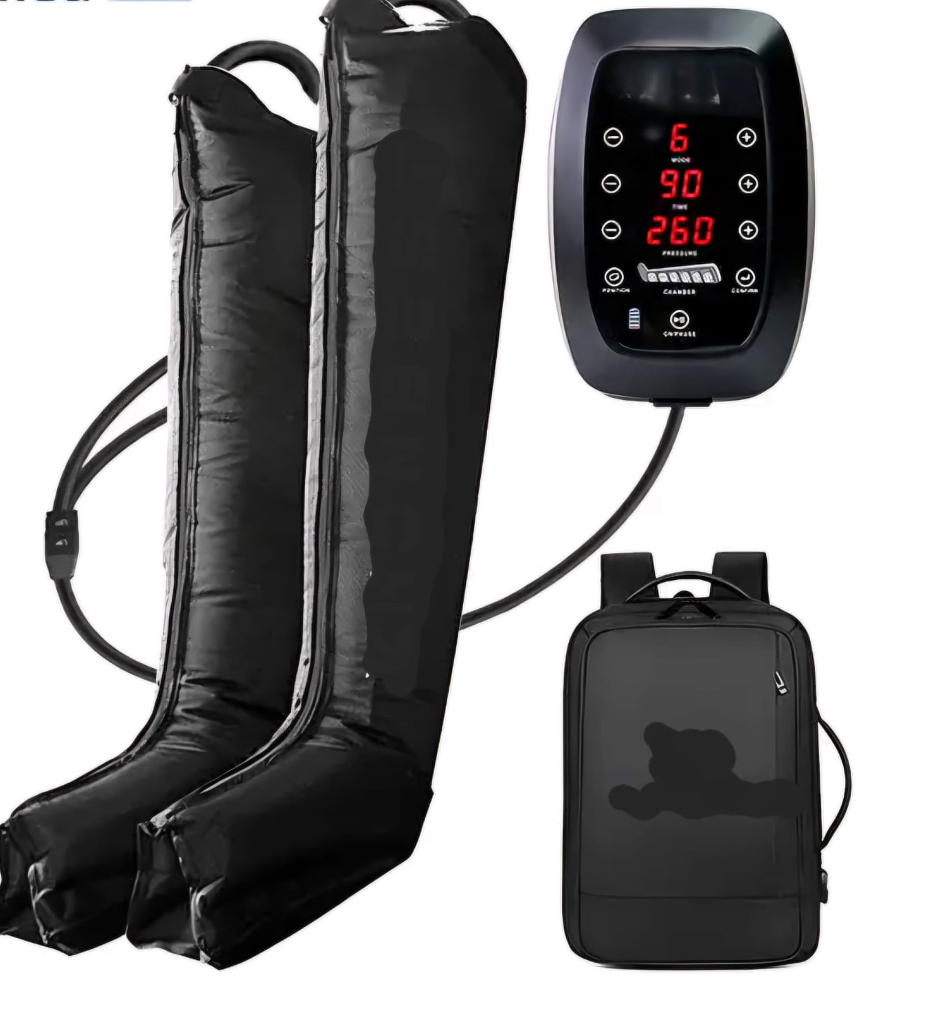 Overlapping function of boots, no dead space. 6 massage modes, pressure gradient from 30 mmHg to 200mmHg. Adjustable time settings 10, 20 or 30 minutes. Portable with carry bag. Various sizes available, plus extension strips if needed.